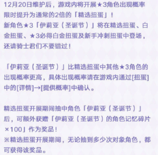 获得方法:维护结束后,游戏内将开启★3角色出现率2倍的「精选扭蛋」,新角色★3「伊莉亚(圣诞节)」(CV:丹下樱)将在「精选扭蛋」中登场!她的出现概率将会比其它三星角色更高。