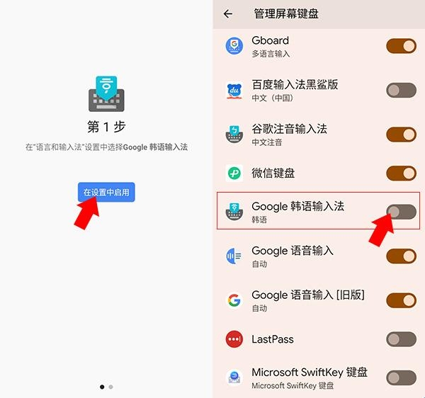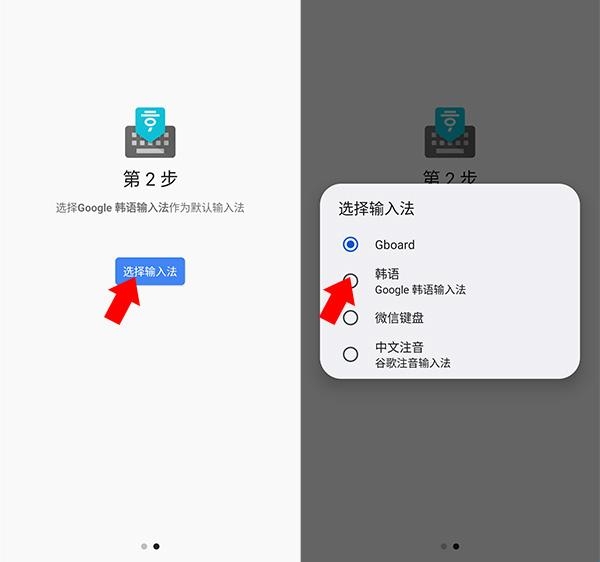 2、以后回到引导界面,点一下选择输入法按键,并在弹出的窗口中选择韩语(google韩语输入法)就可以。