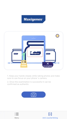 Maxigenes APP就是给美可卓蓝胖子奶粉做防伪标识所使用的,用户可通过app快速地进行扫描,识别取得成功,便是官方真品了,Maxigenes Authenticator应用软件让你在选购Maxigenes产品的时候无忧无虑,只需使用手机上摄像头扫描Maxigenes商品标签就可以认证信息的真实性。