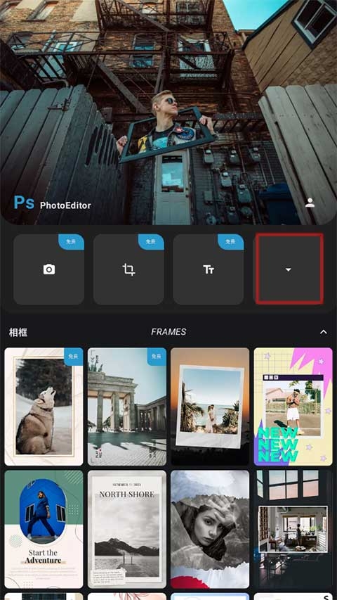 1、开启手机下载的PS图片解决app,点击图标就可以看到很多功能。