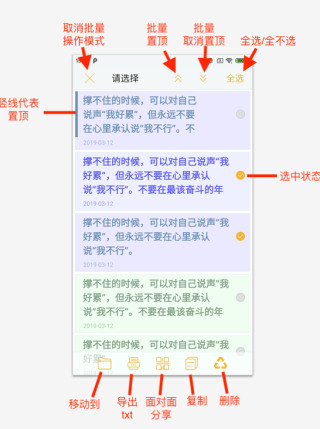 ● 长按屏幕页面的随意一条便签,进到批量处理方式,如下图所示