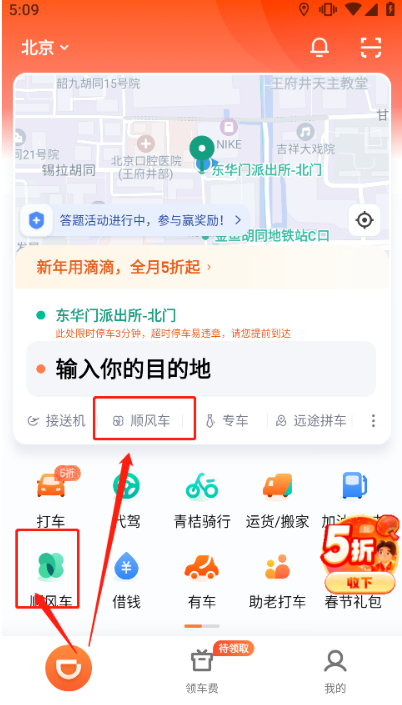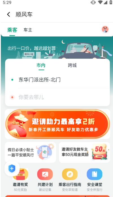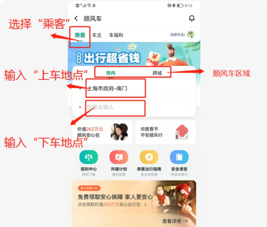 (1)进入app首页,我们可以在下图位置打开“搭便车”