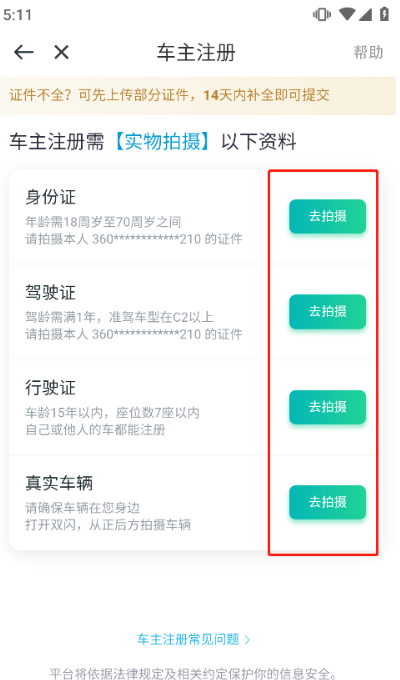 (4)证件齐全的车主可先上传部分证件,14天内补齐材料后提交审核。审核通过后,就可以开始接单了。