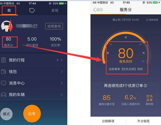 服务分数查看入口:打开司机端“我”-“服务分数”;服务评分每天都会更新。 (无历史订单的司机初始值为80分)