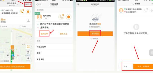 1.点击司机APP订单页面右上角“行程详情”-“取消订单”-“确认取消”-“休息/继续接单”