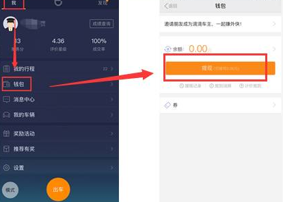 司机门户入口:点击司机门户“我”-“钱包”-“提现”