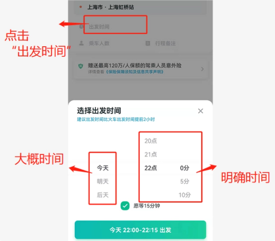 3.页面跳转后点击“出发时间”-下方会弹出时间列表-根据自己的出行时间选择即可(如图3)