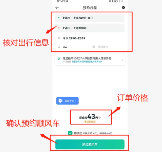 6.核对订单信息无误后-选择最下方“预约顺风车”;(如图6)
