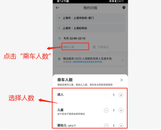 1.人数选择方面必须按照实际人数选填,小孩子也算要单独算一个座位,车辆不可超员;因为出行人填报人数的错误导致的司机拒单,由乘客负责;
