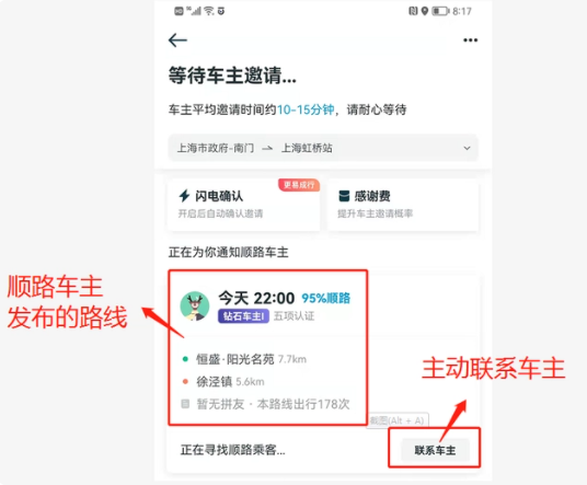 7.叫车发布信息成功-可查看列表中的顺路车的信息-也可以主动联系车主或等车主联系您;(如图7)