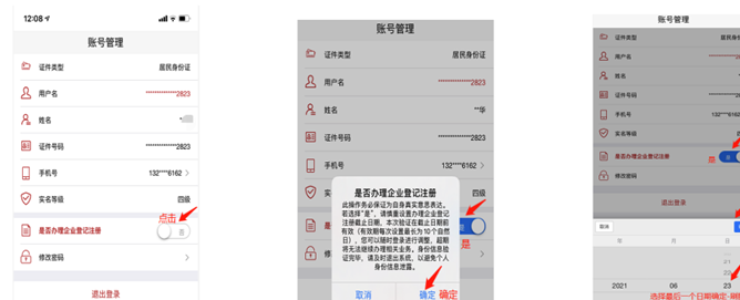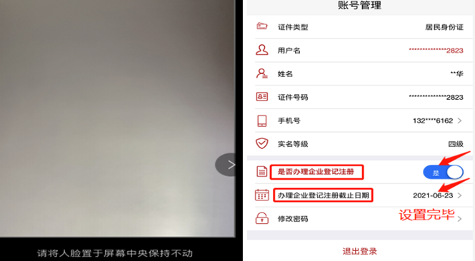 2、人脸识别通过后,进入工商授权实名界面,将“是否注册企业”拖至“是”界面,将日期拖到最后,实名完成。