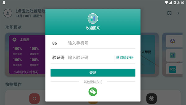 2、首页可以看到各个功能模块,点击首页左上角头像标志,输入手机号码和验证码,或者点击微信即可一键登录。