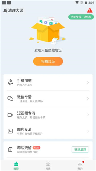2、微信清理:优化常用聊天工具微信,有效识别微信聊天以及运行过程中产生的无用缓存,彻底释放微信空间,运行更流畅。