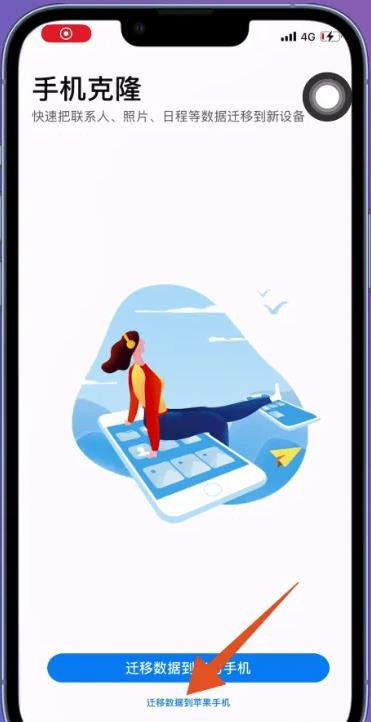 下载苹果手机并打开华为手机克隆应用程序,点击底部的【将数据迁移到苹果手机】。