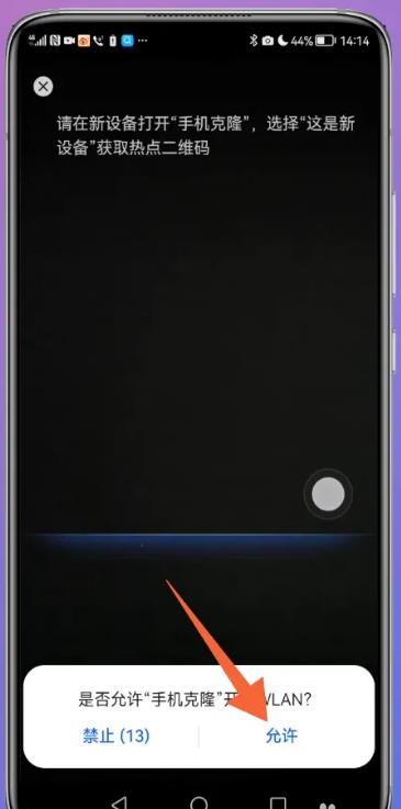 页面底部会弹出一个窗口。在窗口中选择【允许】,点击允许手机克隆即可开启WLAN。