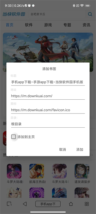 4、点击第二行第二个添加书签按钮,根据自己的情况选择是否添加到首页;