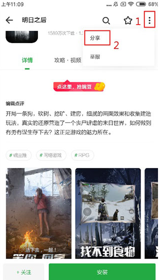 您好,豌豆荚有应用分享功能。请转到应用程序详细信息页面并向下滚动一点。下拉后会显示右上角三个小点的图标。单击并选择共享。