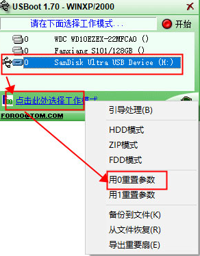 1. 双击运行USBoot 工具。在USBoot界面中,选择无法格式化的U盘。点击选择工作模式,选择参数重置为0