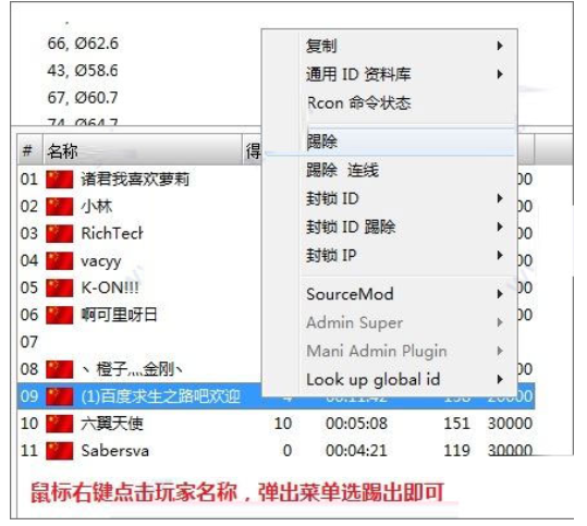 4.如何踢人?右键单击玩家的名字,然后从弹出菜单中选择踢球。