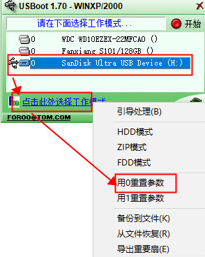 1. 双击运行USBoot 工具。在USBoot界面中,选择无法格式化的U盘。点击选择工作模式,选择将参数清0。