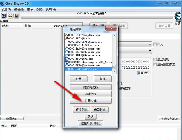 4.您可以从当前运行的游戏进程列表中选择您想要修改的游戏,也可以点击打开文件,选择您想要修改的游戏进程,通常是exe格式。