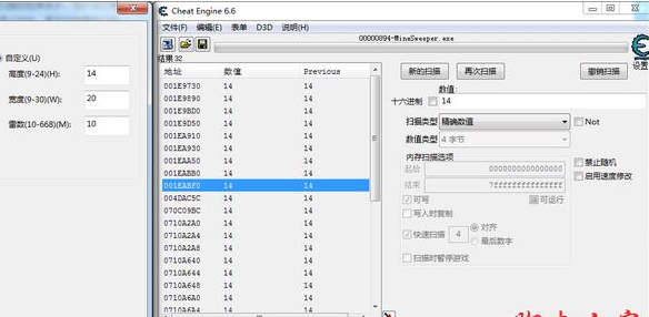 4、点击CE界面上的“新建扫描”(每找到一个物品后,必须点击“新建扫描”才能找到另一个物品),按照第三部分相同的方法,找到扫雷中自定义高度、宽度、地雷数量的内存并修改。你可以这样玩.