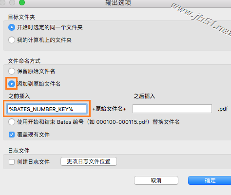 您现在可以添加Bates 编号范围作为文件名的前缀或后缀。要将Bates 编号添加到文件名中,请根据需要在“Bates 编号导出选项”对话框中的“之前插入”或“之后插入”字段中输入%BATES_NUMBER_KEY%。
