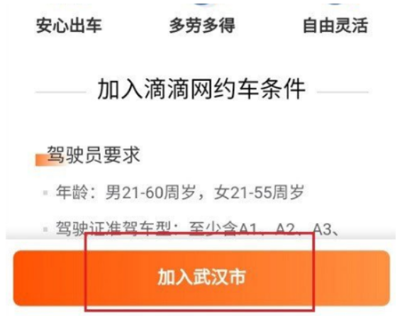 4、进入并加入滴滴成为网约车司机后,选择城市,点击加入。在这里您可以看到加盟条件;