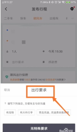 5、确认地点后,我们继续完善信息,首先填写出行要求和出行时间。出行时间一定要准确,防止出错。如下图