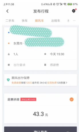 4.然后输入行程的出发地和目的地,包括具体出发时间。选择后,点击【确认发布】