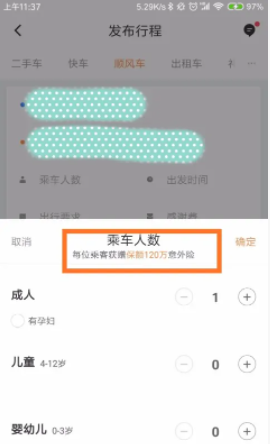 6. 接下来,我们填写乘客人数。如果你赶时间的话,可以给滴滴出行司机一些谢钱,这样你就可以尽快搭车了,如下图。