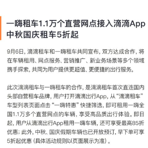 滴滴租车与一嗨租车联合宣布达成合作,将共同探索车辆租赁、奥特莱斯服务、营销推广、新业务场景等多个领域,共同为用户提供更超值、更便捷的出行服务。即日起,在滴滴App租车怡海可享受最高15%优惠;中秋、国庆期间租车还可享受50%起的优惠。此消息来自滴滴出行微博消息