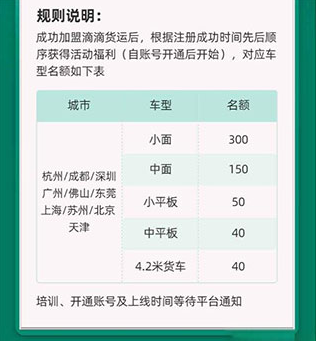 5月18日起,滴滴货运将招募司机。首批试点城市为杭州、成都,将开始为期一个月的司机招募。目前,试点城市已扩大至北京、天津、上海、苏州、杭州、成都、广州、深圳、东莞、佛山10个城市。正式培训、开户以及滴滴平台上线时间尚未公布。